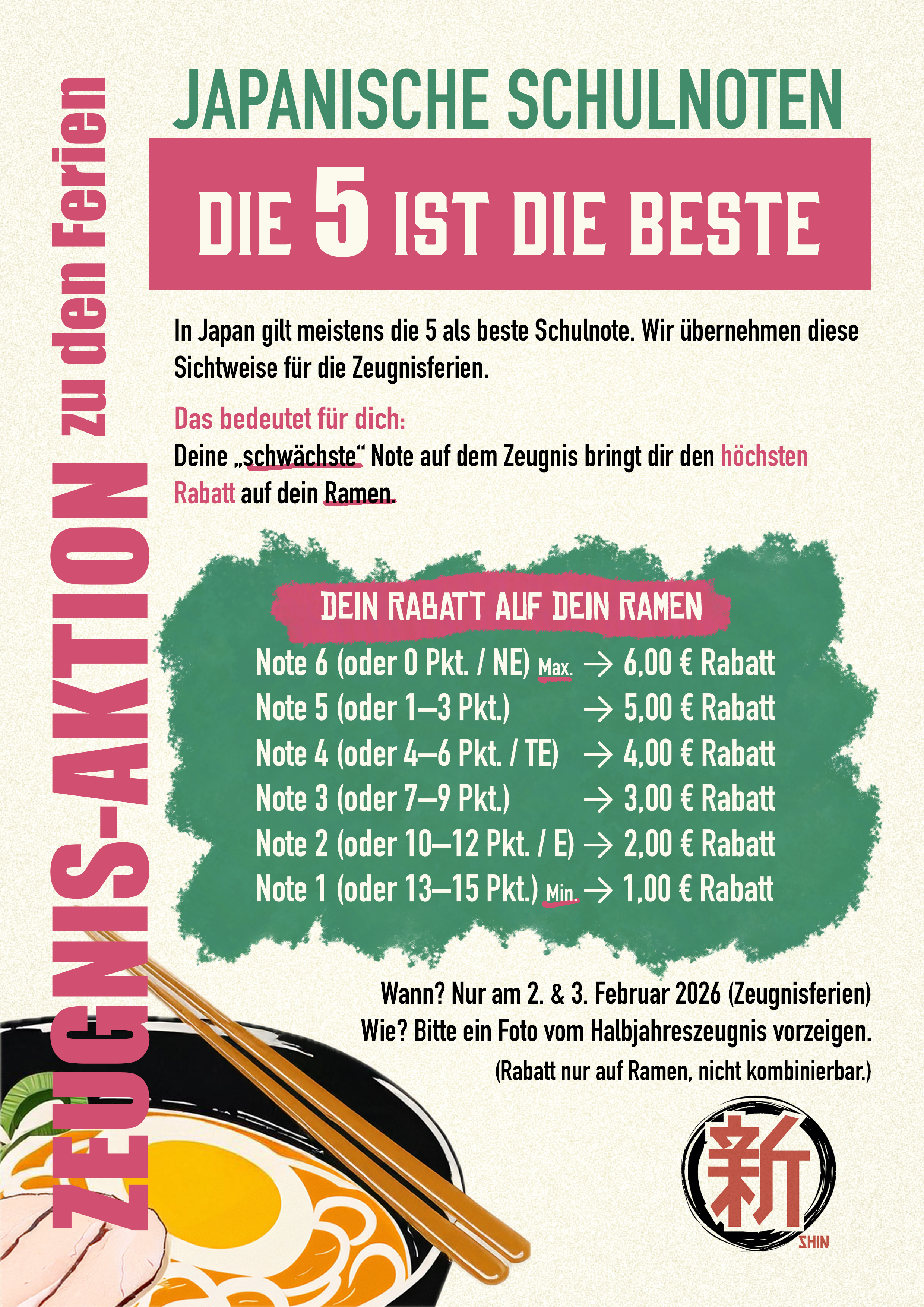 Deshalb machen wir es jetzt zu den Zeugnisferien auf die japanische Art! 🇯🇵 Wir drehen den Spieß um. Tauscht euren kleinen „Frust“ gegen leckere Ramen – denn bei uns ist deine „schwächste“ Note heute ein Hauptgewinn: